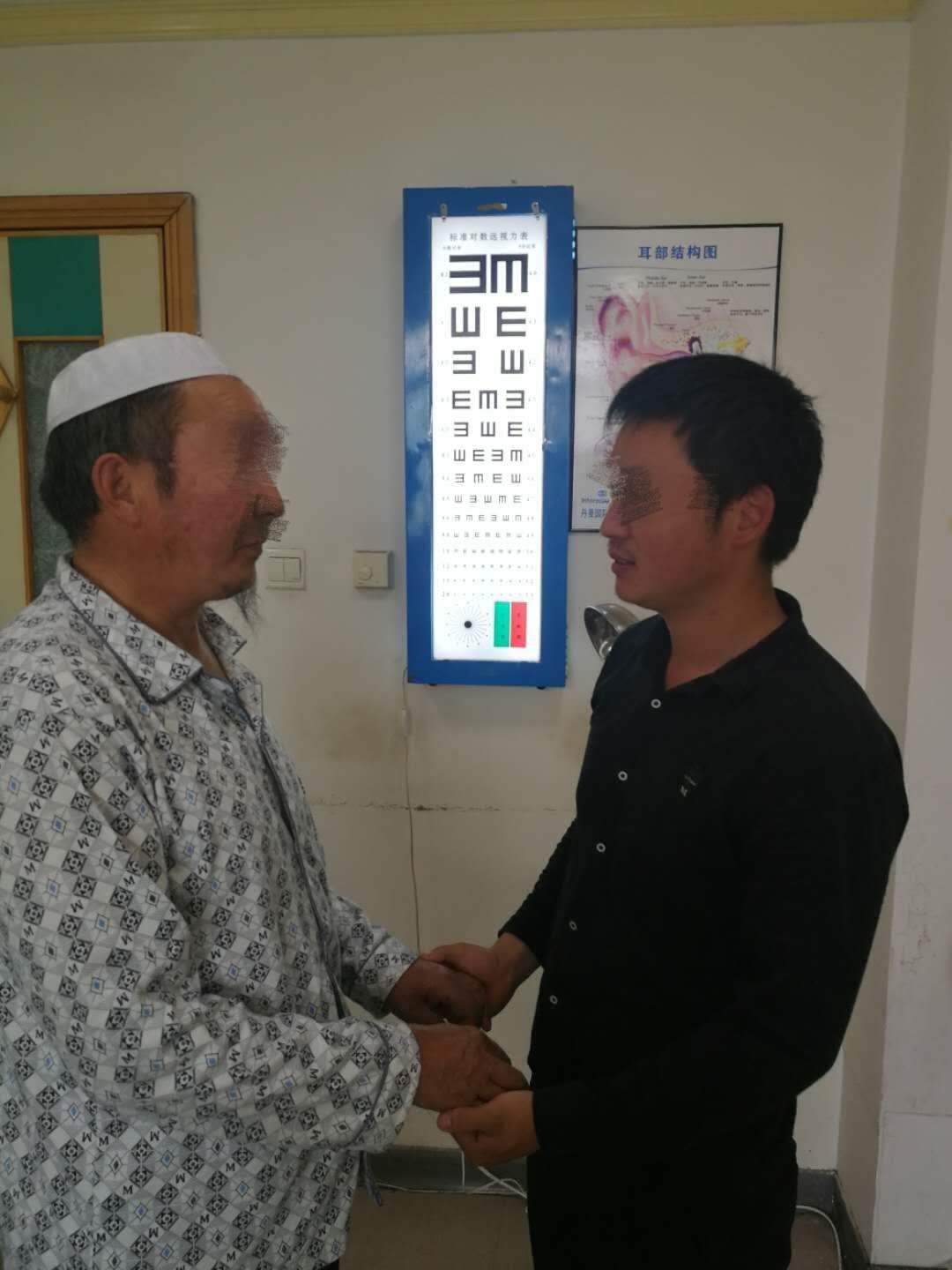 术后第三天,邢老伯右眼裸眼视力已大于0.05;1米距离可看清0.4。邢老伯二十多年的愿望终于实现了,对上海来医生连连道谢,邢老伯右激动地拉着儿子的手,不停地说:“儿子,我又看到你了!”。