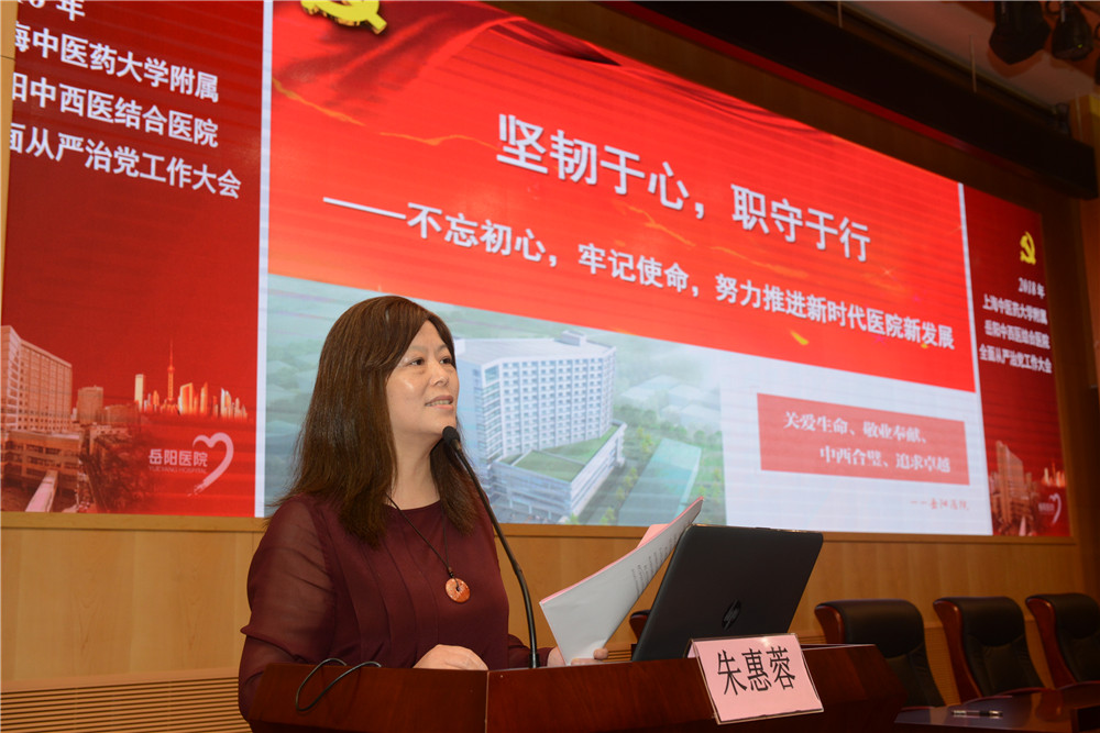 5月22日下午,我校附属岳阳中西医结合医院全面从严治党工作大会在院学术报告厅召开。校党委副书记、副校长朱惠蓉出席,岳阳医院党委副书记、院长周嘉,党委副书记、纪委书记朱亮,副院长沈雁、梅国江,总会计师徐明磊,以及全院中层干部及职工150余人参加,会议由周嘉主持。