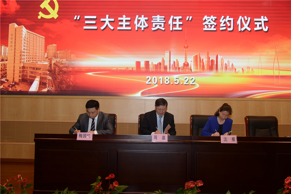 随后,大会举行“三大主体责任”和“2018年岳阳医院安全责任制”签约仪式。院长书记与班子成员代表进行“三大主体责任”(一岗双责)责任书的签约,班子成员(分管领导)代表与职能科室负责人签订党风廉政建设责任书。