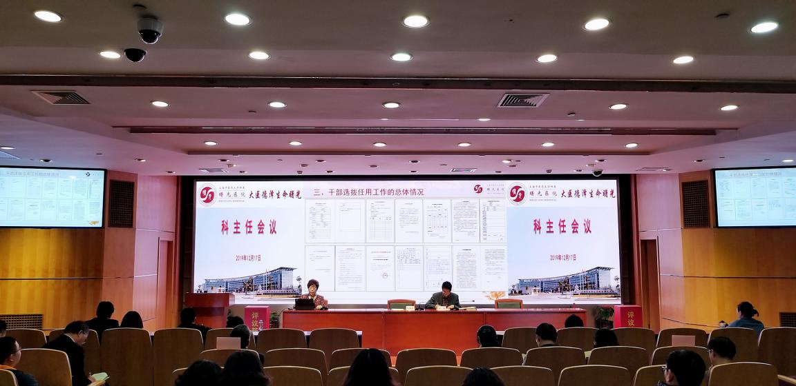 12月17日下午,曙光医院在东院学术报告厅召开2019年度干部选拔任用“一报告两评议”会议,医院党政领导班子、党委委员、纪委委员、职能部门负责人、各科室主任、党支部书记、护士长等百余人参加评议。会议由曙光医院党委副书记、院长周华主持。