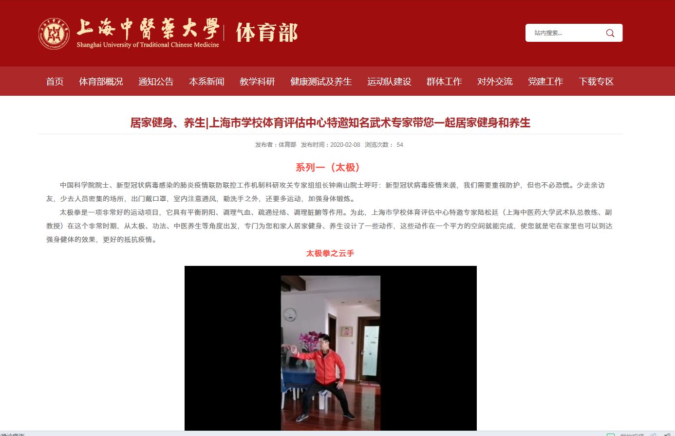 在新冠肺炎疫情防控阻击战中,广大人民群众响应国家号召不外出。长期居家、久坐不动,易致情绪不稳,机体免疫力降低。根据疫情防控工作情况,体育部党支部结合学校的优势和特点,强化宗旨意识和服务意识,1月末先后创编并推出以“居家战‘疫’,以‘武’助力”为主题的五禽戏、八段锦、太极、武术拳操等功法套路,同时通过中华中医药学会、上海市教育委员会、上海市教育委员会艺术教育处、上海市学校体育评估中心、上海武术院等部门的相关平台推广,并被学习强国、校级微信公众号等平台转载。这一系列功法套路,面向社会大众广泛传播,为打赢疫情防控阻击战增添战斗力。