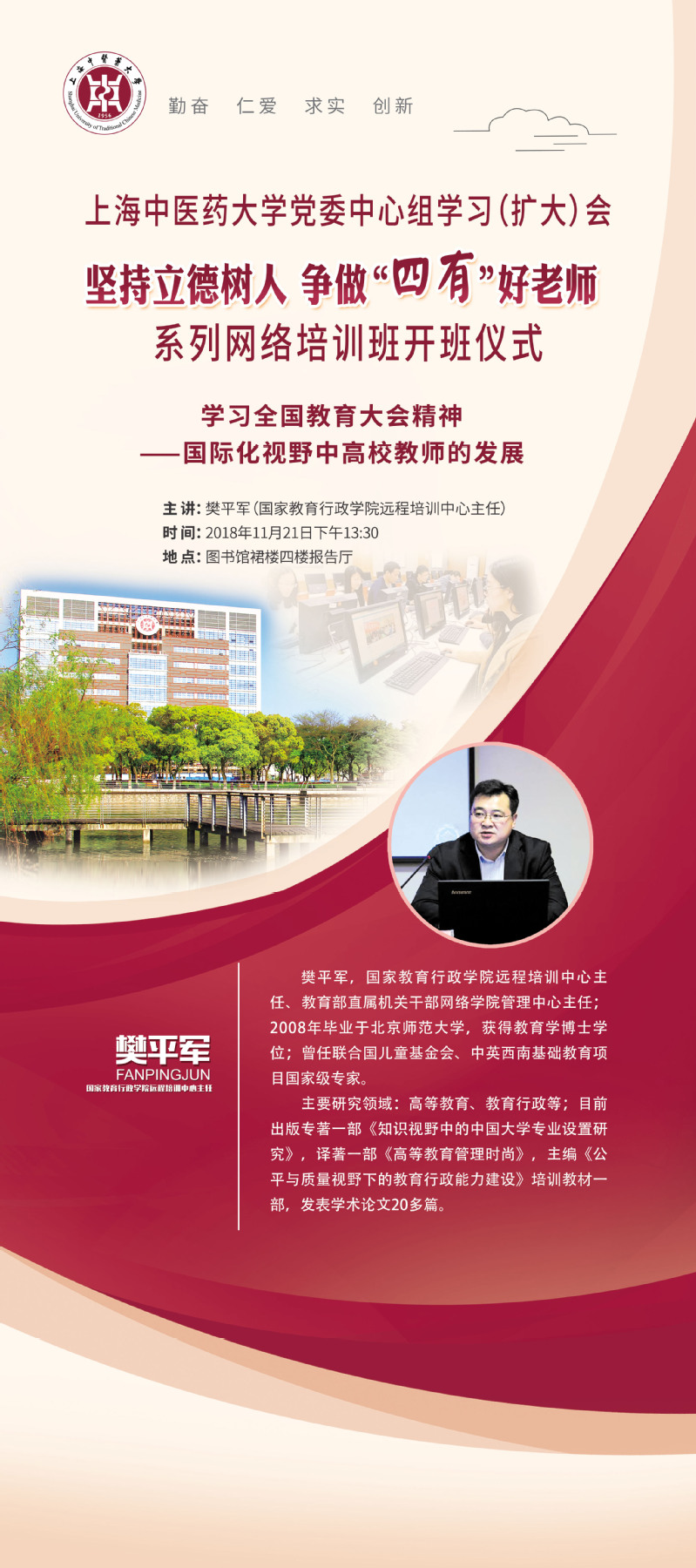 讲座:“坚持立德树人 争做‘四有’好老师”系列网络培训班开班仪式(学习全国教育大会精神——国际化视野中高校教师的发展)