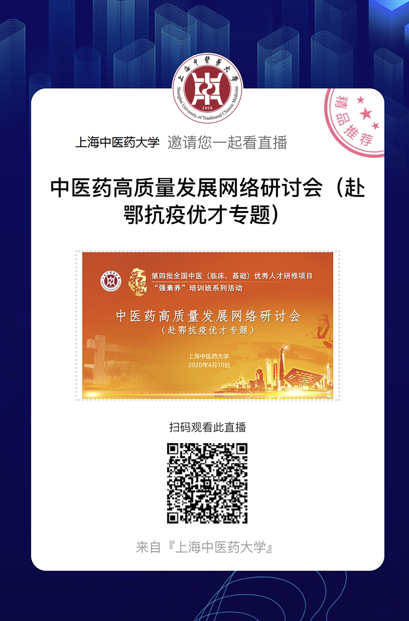 4月10日,我校组织开展中医药高质量发展网络研讨会(赴鄂抗疫优才专题)。本次研讨会为我校承办的第四批全国中医(临床、基础)优秀人才研修项目“强素养”培训班的系列活动之一,是培训班主题论坛的首次活动。