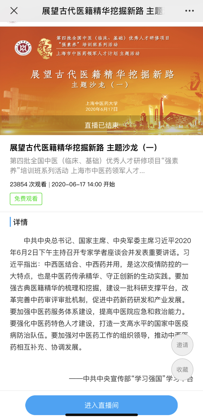 为深入学习贯彻习近平总书记6月2日特别强调“要加强古典医籍精华的梳理和挖掘”的讲话精神,6月17日,我校举办“展望古代医籍精华挖掘新路”网络主题沙龙。此次活动是我校承办的第四批全国中医优秀人才研修项目“强素养”培训班和上海市中医药领军人才计划的系列活动之一,也是我校唐宋医学教研团队主题沙龙。网络直播持续两个小时,受到来自海内外的专家、学者、学生和医疗同道2万余人的关注。