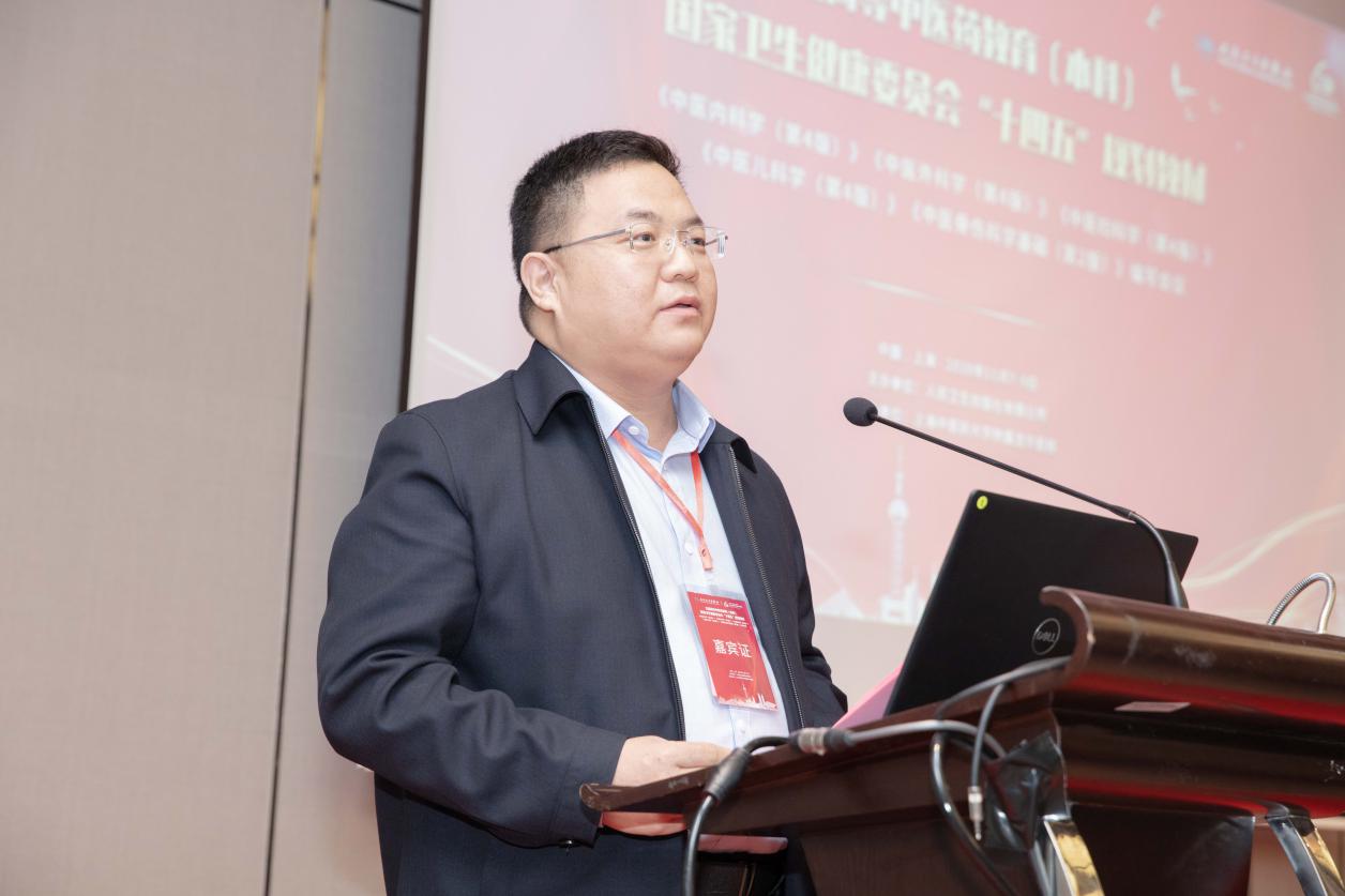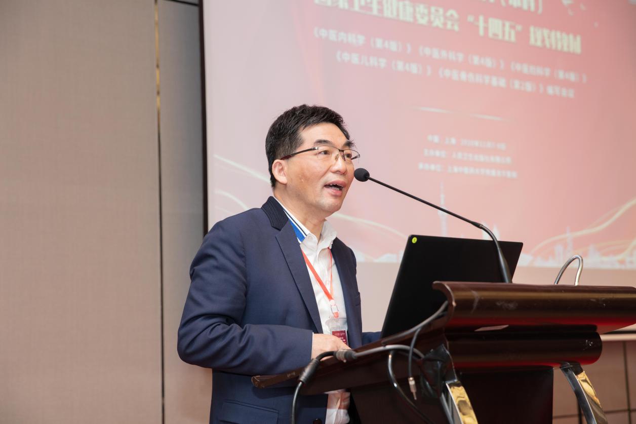 朱双龙致辞,他介绍了人民卫生出版社坚持以“根植卫生健康、服务健康中国”为引领,服务医药卫生文化事业产业创新发展,特别是人卫中医全面推进中医药原创精品学术出版、教材建设和数字化转型融合发展,取得丰硕成果,并对“十四五”中医药教材未来建设方向提出宝贵建议。