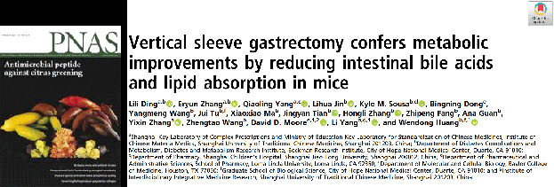 近日,我校杨莉研究员、王峥涛教授团队和美国希望城国家医学中心黄文栋教授合作,在胆汁酸介导减重手术调控糖脂代谢作用机制研究方面取得重大进展,研究成果Vertical sleeve gastrectomy confers metabolic improvements by reducing intestinal bile acids and lipid absorption in mice发表于《美国科学院院刊》(Proceedings of the National Academy of Sciences of the United States of America, PNAS2021, 118: 6 e2019388118; doi.org/10.1073/pnas. 2019388118)。
