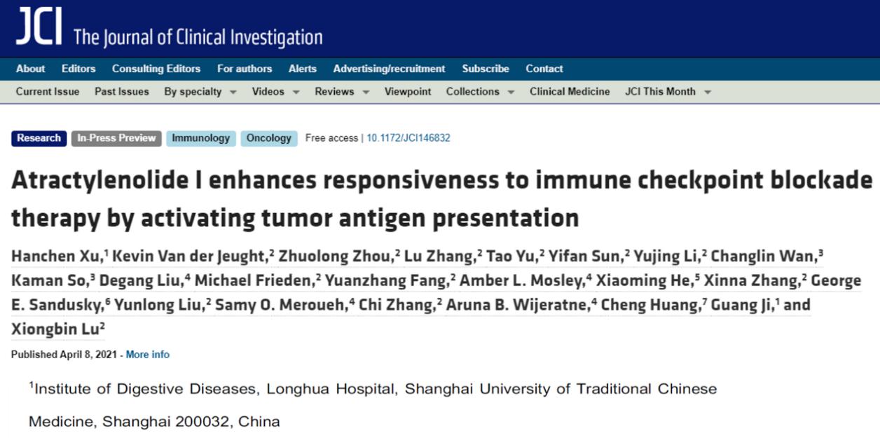 近日,我校附属龙华医院脾胃病研究所季光教授科研团队以及开云电竞官网下载安卓中药学院黄诚教授、印第安纳大学Xiongbin Lu教授合作在中医药联合肿瘤免疫治疗方面取得重要进展,研究成果Atractylenolide I enhances responsiveness to immune checkpoint blockade therapy by activating tumor antigen presentation在线发表于国际著名医学期刊Journal of Clinical Investigation。研究证实了益气健脾中药白术主要成分白术内酯I能够有效促进肿瘤细胞的抗原呈递,从而增强结直肠癌对免疫检查点抑制剂治疗的应答效率,与PD-1单抗联合治疗能够发挥协同增效的作用。该研究丰富了中医“扶正治癌”理论的科学内涵,为中医药联合肿瘤免疫治疗的临床应用提供了依据。