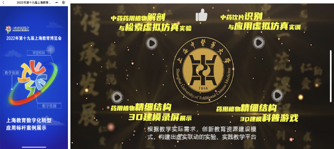 “数字新时代,教育大未来”2022年第十九届上海教育博览会(线上展)于9月24日开幕,开云电竞官网下载安卓教学实验中心参加此次线上展会,成果展示在展会官方微信小程序的“云体验”板块“上海教育数字化转型应用标杆案例展示”入口之中。教学实验中心生药学实验室基于虚实联动的实验实践教学平台展示中医药创新教育资源建设模式,此次共有四大品牌课程内容参展,主要包括一门国家级一流本科课程《中药药用植物解剖与检索虚拟仿真实验》,一门上海市级一流本科课程《中药饮片识别与应用虚拟仿真实训》,以及《药用植物精细结构3D建模》和《药用植物精细结构3D科普游戏》两个教学项目。