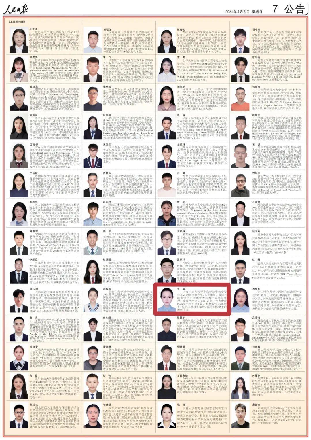 近日,《人民日报》刊登了《2022—2023学年度研究生国家奖学金获奖学生代表名录》。据悉,经过严格选拔和评审,全国4.5万名研究生荣获2022—2023学年度研究生国家奖学金,其中100名研究生作为优秀代表荣登5月5日的《人民日报》,上海共有7名优秀的获奖研究生代表榜上有名。我校硕士研究生张淼名列其中,这也是我校学生首次入选该名录。