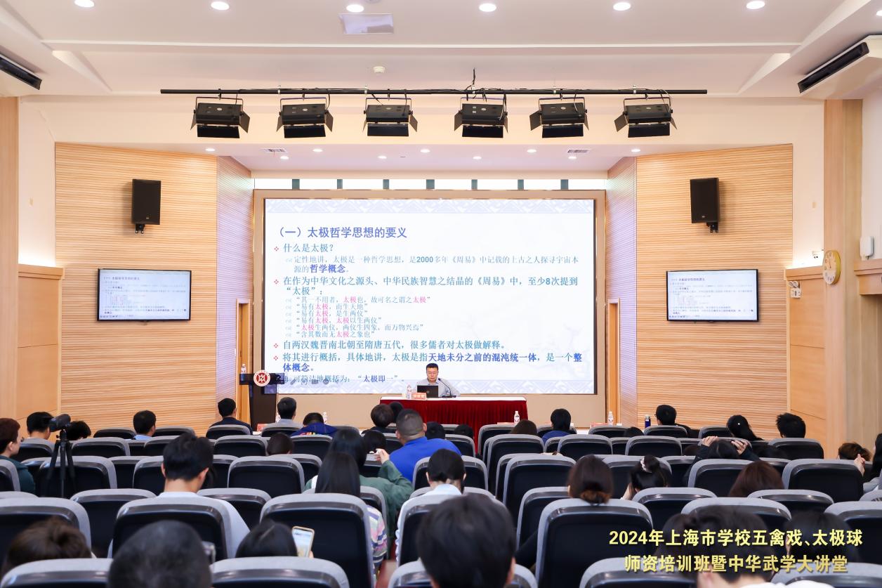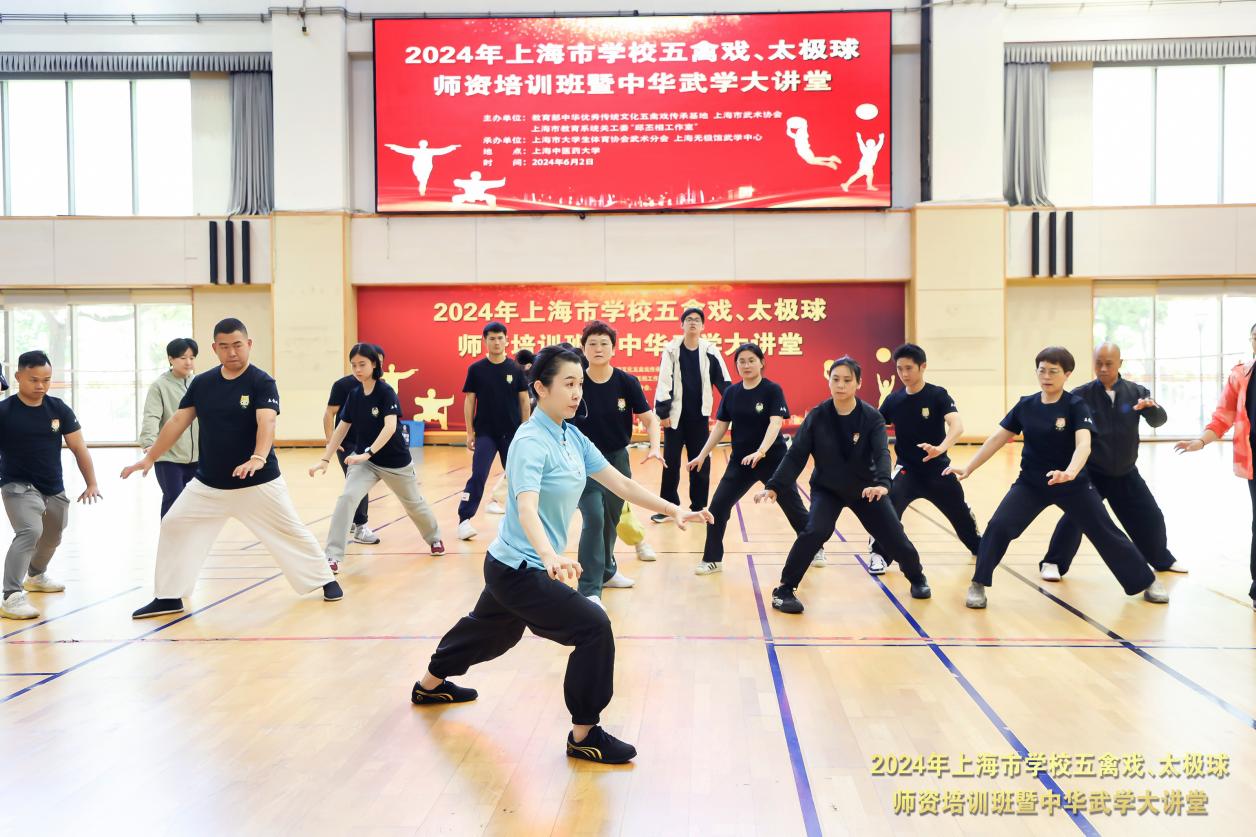 为促进中华优秀传统体育文化传承发展,深入推进中华优秀传统体育项目进校园,进一步提高学校武术教师理论及教学实践水平,6月2日,由教育部中华优秀传统文化五禽戏传承基地、上海市武术协会、上海市教育系统关工委“邱丕相工作室”主办,上海市大学生体育协会武术分会、上海无极馆武学中心承办的2024年上海市学校五禽戏、太极球师资培训班暨中华武学大讲堂在我校举办,来自沪上50家单位的70余名武术教师参加,同时也吸引了我校40余名热爱武术的大学生参会。