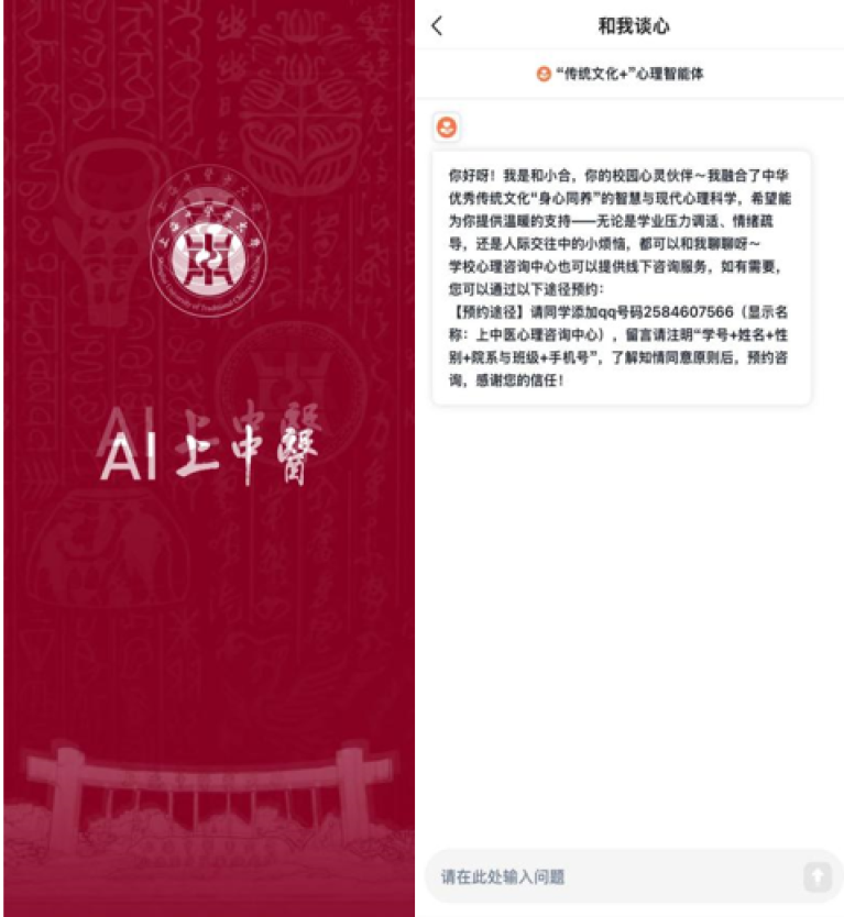 这一智能体是基于上中医本地化部署满血版Deepseek研发的,融合了中华优秀传统文化“身心同养”的智慧与现代心理科学,是运用AI技术赋能学生心理健康的重要实践,也是上海市高校心理示范中心的创新成果。