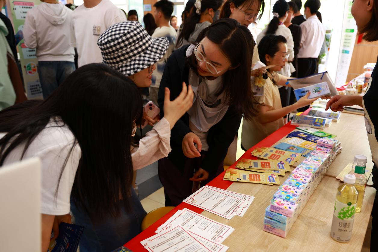 食品卫生与营养学专业学生向来往师生展示精心设计的营养知识海报、发放营养宣教手册,并阐释膳食搭配原则和运动健康效益,吸引众多师生驻足参与,为在场师生带来了丰富的营养与运动、营养与体重、营养与健康等知识。