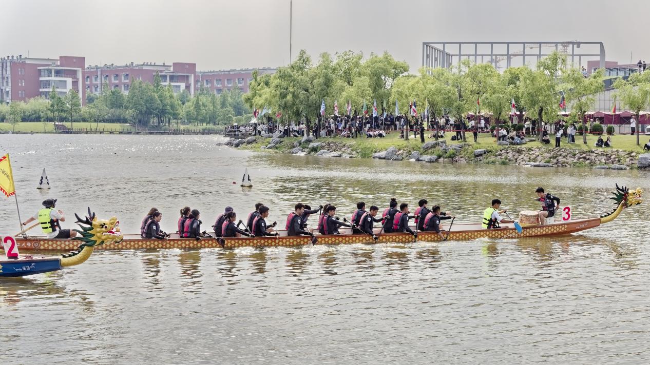 随着发令枪响,上中医的龙舟如离弦之箭破浪而出。18支船桨整齐划一地插入水中,激起阵阵浪花。鼓手徐迪航的鼓点铿锵有力,与队员们的呐喊声交织在一起。赛道两旁,“上中医加油”的助威声此起彼伏,国际教育学院师生组成的啦啦队挥舞着双手,成为赛场上一道亮丽的风景线。