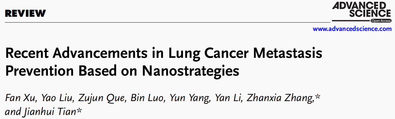 近日,我校附属市中医医院田建辉教授团队在国际知名学术期刊Advanced Science上发表题为“Recent advancements in lung cancer metastasis prevention based on nanostrategies”的综述。该论文结合肺癌转移的防治现状及面临的挑战,全面总结近年来纳米技术在肺癌转移防治中的最新研究进展,并详细梳理纳米药物的临床转化前景,以期为肺癌转移的防治研究提供新的思路与方向。