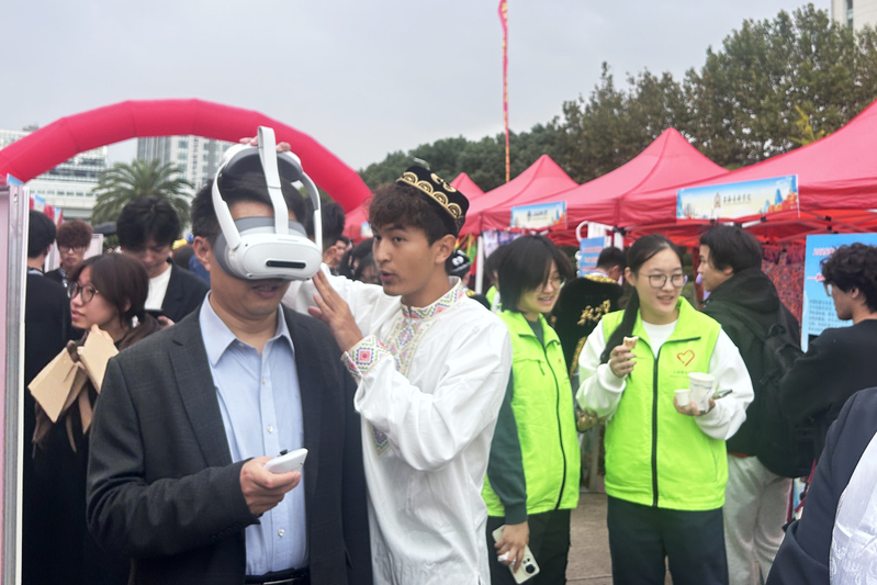 在特色展示区域,我校重点展示了上海中医药博物馆的中药植物标本和中医药系列养生茶。学生们为前来打卡体验的师生介绍我校博物馆特色,讲解生活中常用中药的药用价值和使用方法,还亲手泡制了养生茶供大家品尝。校民族联教师代表还为现场师生提供健康咨询等服务。尤为亮眼的是我校带来的中医体验VR项目,现场师生戴上VR眼镜、手持操作手柄,便能沉浸式“云游”中医药世界。这一创新形式解锁了“古今穿梭”“数字赋能”的中医药文化体验新范式,让传统医药文化在科技助力下更具吸引力。