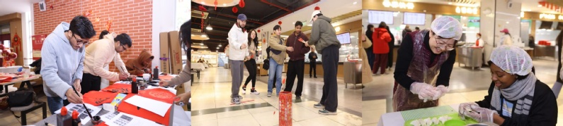 教师们走进学生食堂,与留校国际学生一同体验福字书写等传统文化项目。随后,师生围坐一起,包馅、捏褶,共同制作寓意团圆美满的饺子。