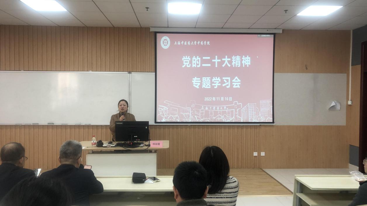 为深入学习宣传贯彻党的二十大精神,深刻理解把握精神实质和核心要义,汲取奋进力量,11月16日下午,中药学院党委邀请我校“杏马”理论宣讲团、马克思主义学院副教授杨丽霞在10105为师生作党的二十大精神专题辅导报告。学院领导班子、全体党员和教师参加本次学习,会议由中药学院党委书记沈岚主持。