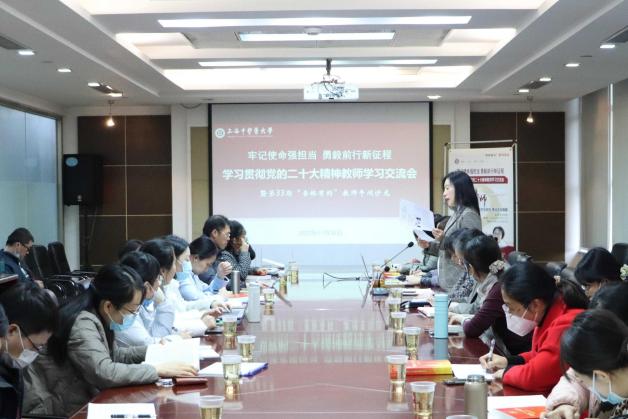 11月30日下午,“牢记使命强担当 勇毅前行新征程——深入学习宣传贯彻党的二十大精神”教师学习交流座谈会暨第33期“杏林有约”教师午间沙龙在行政中心312会议室举办。我校“杏马”理论宣讲团成员、马克思主义学院教授张静作“坚定文化自信,建设文化强国”专题辅导报告。宣传部(党委教师工作部)副部长刘虹主持会议,并向张静颁发“阳光导师”荣誉证书。教师党支部书记、青年教师班主任等40余人参加学习交流。