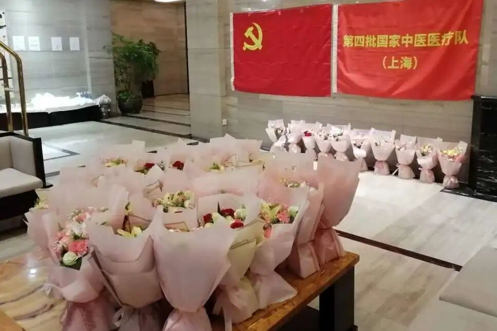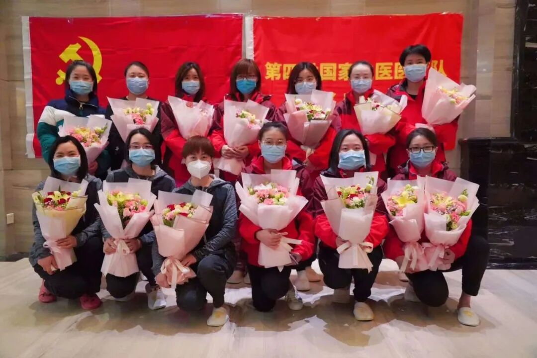 在驻地,女性医护人员们收到了后方为她们送上的鲜花。岳阳中西医结合医院的女队员们手捧鲜花,她们都是无畏“逆行”全力抗疫的“最美守护者”。