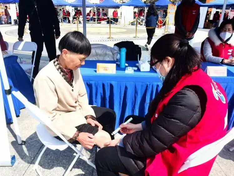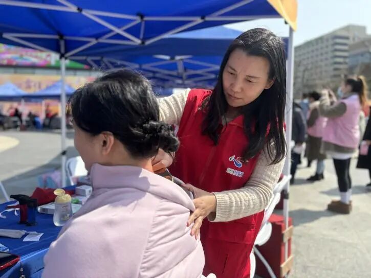 在活动开始前,就已经有一些群众坐在摊位前排队等待特色推拿服务。在对他们进行简单的问诊后,志愿者服务队师生给每一位前来排队的人们进行推拿服务并进行健康宣教。