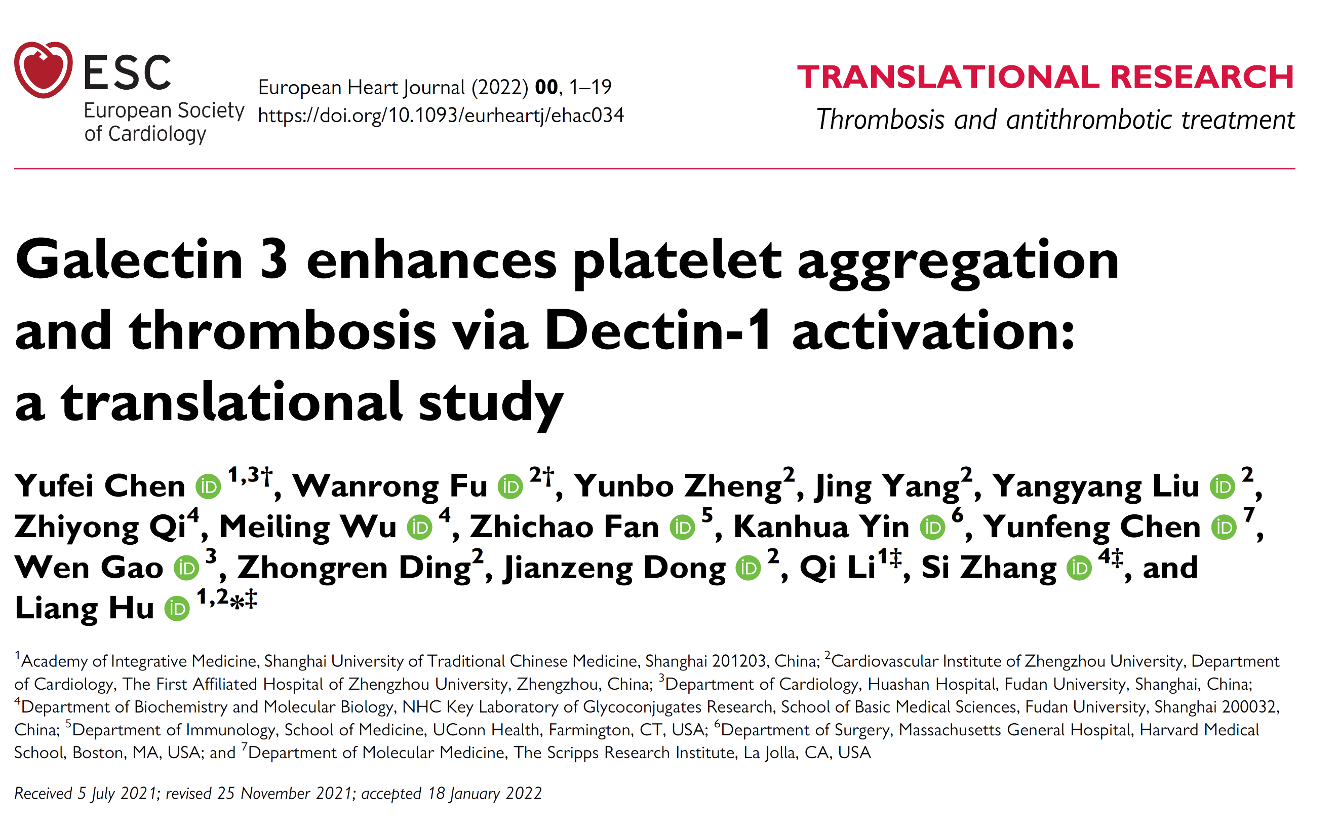 近日,欧洲心脏协会会刊European Heart Journal(IF=29.983)以Research Article在线发表了开云电竞官网下载安卓中西医结合研究院胡亮团队最新研究成果-“Galectin 3 enhances platelet aggregation and thrombosis via Dectin-1 activation: a translational study”,首次提出: (1)Galectin-3结合血小板膜表面的C型凝集素Dectin-1受体,促进血小板聚集和血栓形成。(2)TD139作为一种II期临床试验中应用的Galectin-3抑制剂,能抑制Galectin-3介导的血小板活化和血栓形成,且不加剧出血风险。(3)靶向Galectin-3可能作为心血管疾病治疗的新策略。针对Galectin 3/Dectin-1信号通路,研究团队发现柑橘果胶和β-葡聚糖等多个具有优秀的抗血小板作用的天然活性产物。