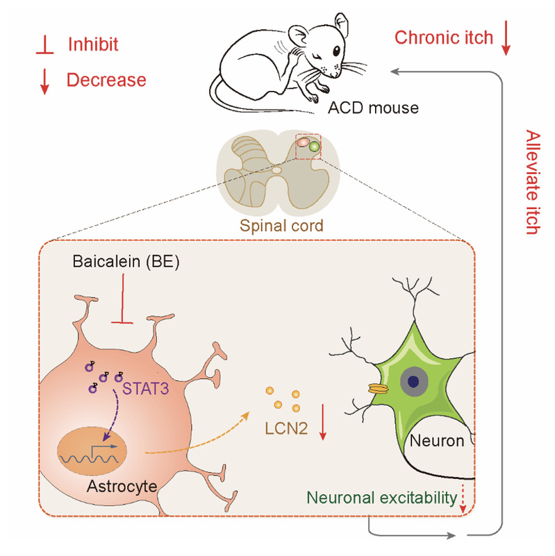 近日,我院王志菲研究员团队在Acta Pharmacologica Sinica上发表了题为“Baicalein ameliorates chronic itch in ACD mice by suppressing the spinal astrocytic STAT3–LCN2 cascade”的研究论文。该研究阐明了黄芩素(Baicalein, BE)通过抑制脊髓星形胶质细胞STAT3–LCN2通路缓解小鼠慢性痒的作用机制,揭示了黄芩素治疗慢性痒的重要药用价值,为慢性痒治疗方法的开发提供了重要的科学依据。