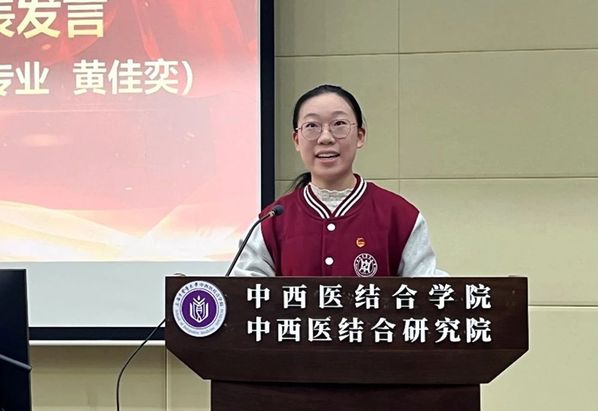 2023级中西医临床医学专业黄佳奕同学作为本科生代表发言。她讲述了和中医药的结缘故事,号召广大学子应抓住时代的机遇,借助导师团的平台,秉持孜孜不倦的学习态度,志存高远,成为德才兼备的现代中医人。