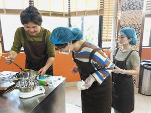 随后,大家取回经过发酵的面团,用称量工具把面包胚等分成多个小剂子,在案板上轻轻地整理、搓圆、按压,包入红豆沙馅,将注意力集中在每一个制作细节,感受“正念”的魅力,最后将成品送入烤箱醒发、烘烤。