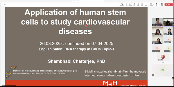 继首次线上学术研讨会的成功举办并取得良好反响后,中西医结合学院于2025年4月7日开展“Gene Therapy in Cardiovascular Diseases”系列第二场线上学术研讨会。本次研讨会的主题是: Application of human stem cells to study cardiovascular diseases,聚焦诱导多能干细胞衍生心肌细胞(iPSC-CM)在心血管疾病治疗中的前沿应用,特邀德国汉诺威医学院转化科学家Shambhabi Chatterjee博士担任主讲嘉宾,由本院青年研究员吕东潮博士邀请嘉宾出席,并由22级中药学专业郑雨轩同学担任主持。