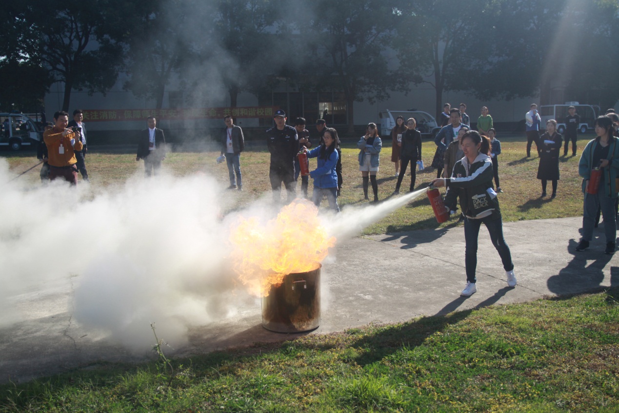 随后,所有参加演练人员在后女贞路草坪上体验灭火器灭火,使广大教职员工学会初期火灾正确运用灭火器进行火灾扑救。