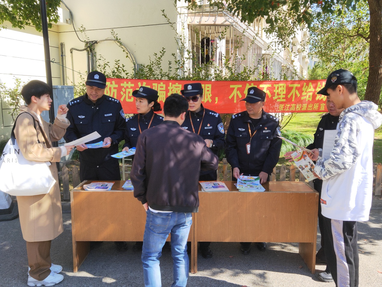 首先,11月9日中午11:00在学生生活园区内开展了消防知识宣传和主题为“防范诈骗擦亮眼,不信不理不给钱”的防范诈骗宣传活动。
