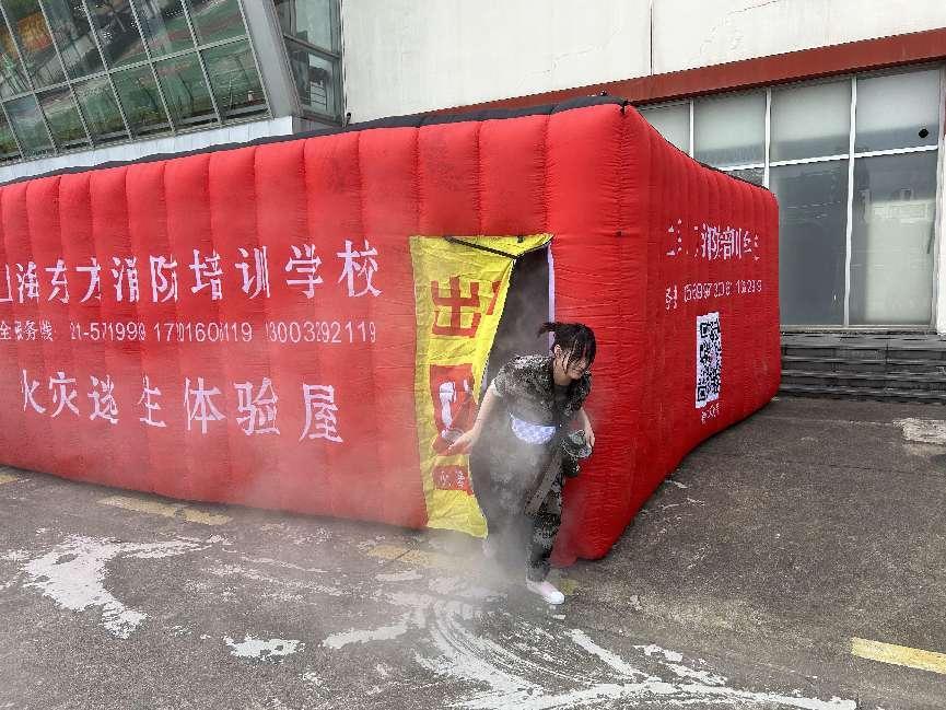 此次消防演练活动增加了消防逃生疏散体验环节,每位新生依次弯腰低头进入模拟屋。火灾逃生体验屋内弥漫着烟雾,光线昏暗,只有逃生指示牌散发着绿光。大家按照指示牌的指引,紧靠墙壁,慢慢前进,顺利找到出口逃出。