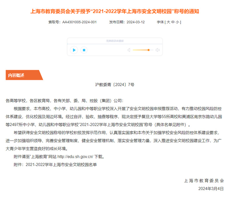 喜报|我校被评为“2021-2022学年上海市安全文明校园”