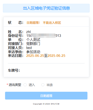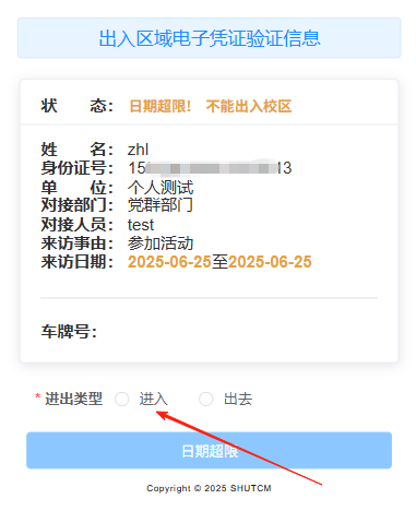 安保人员查看验证信息状态,系统会自动计算进入日期是否符合当前时间,仔细核对日期和身份信息,查看状态,可放行。