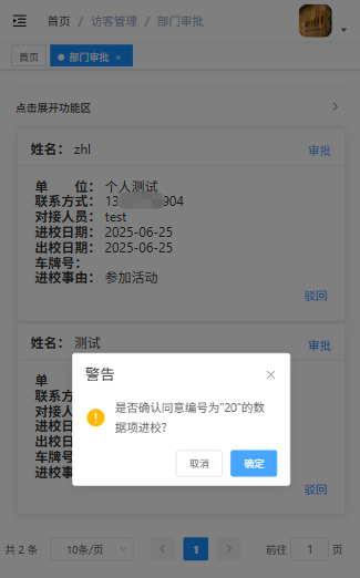 成功登录系统后,访客审批点击【访客管理】【对接人审批】;将能看到本人员申报信息。请审核人仔细核对申报信息,确认无误后,点击【审批】在弹窗中再次确认申报信息,无误后点击【同意】。