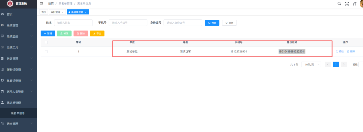 点击【黑名单管理】【黑名单信息】查看;如需移除黑名单,点击【删除】即可。