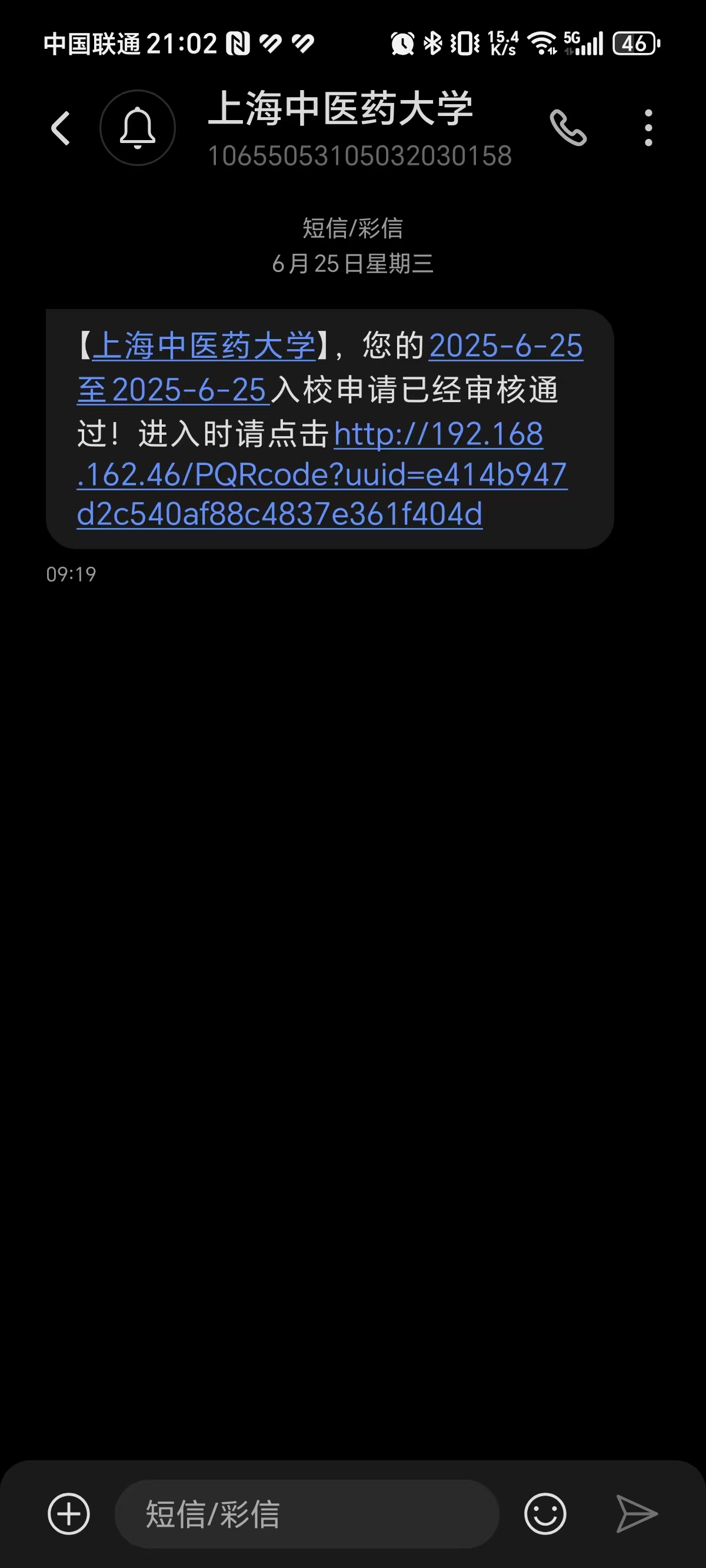 操作完成后,申请人会收到短信,内含进校通行二维码链接,点击可生成进校二维码电子凭证。