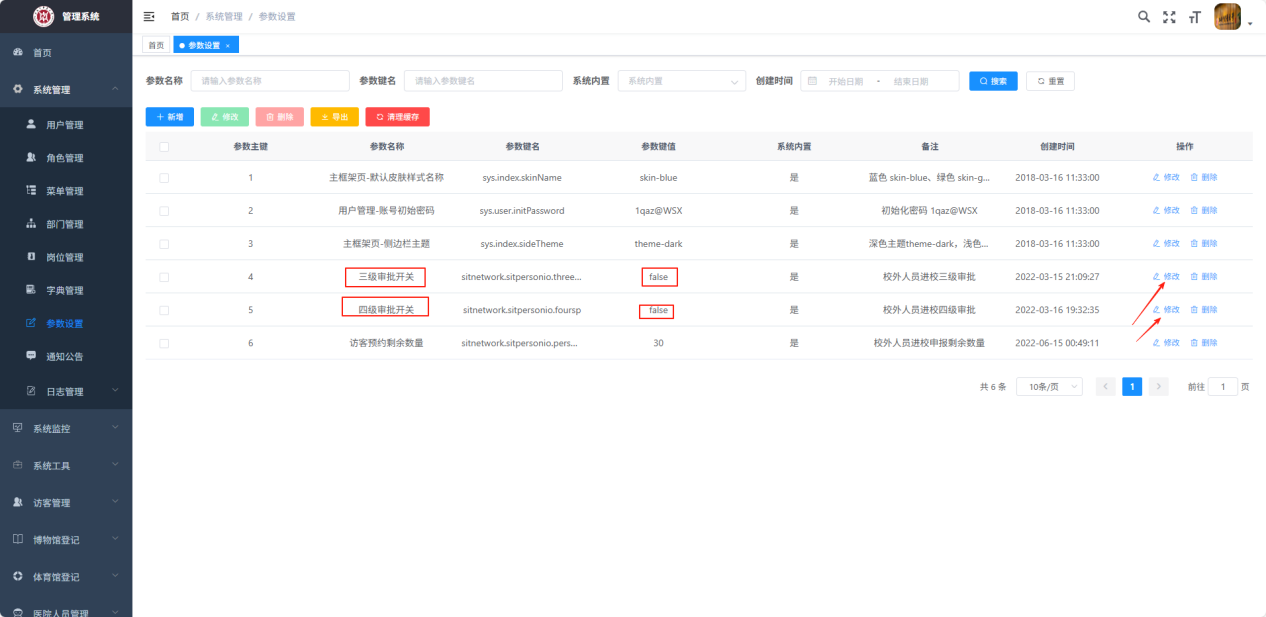 注:管理员,可在系统后台,【参数设置】打开或关闭三级、四级审批开关。