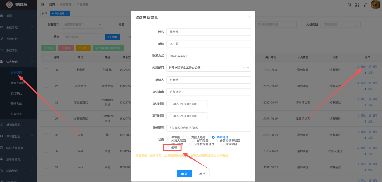 审批通过后的访客,如果想让其二维码失效,管理员可以修改状态为撤销,这样访客二维码刷人行通道核验就会不通过。点击【访客管理】【审批管理】进入所有访客列表页面【修改】状态栏里选择“撤销”,点击【确认】即可;