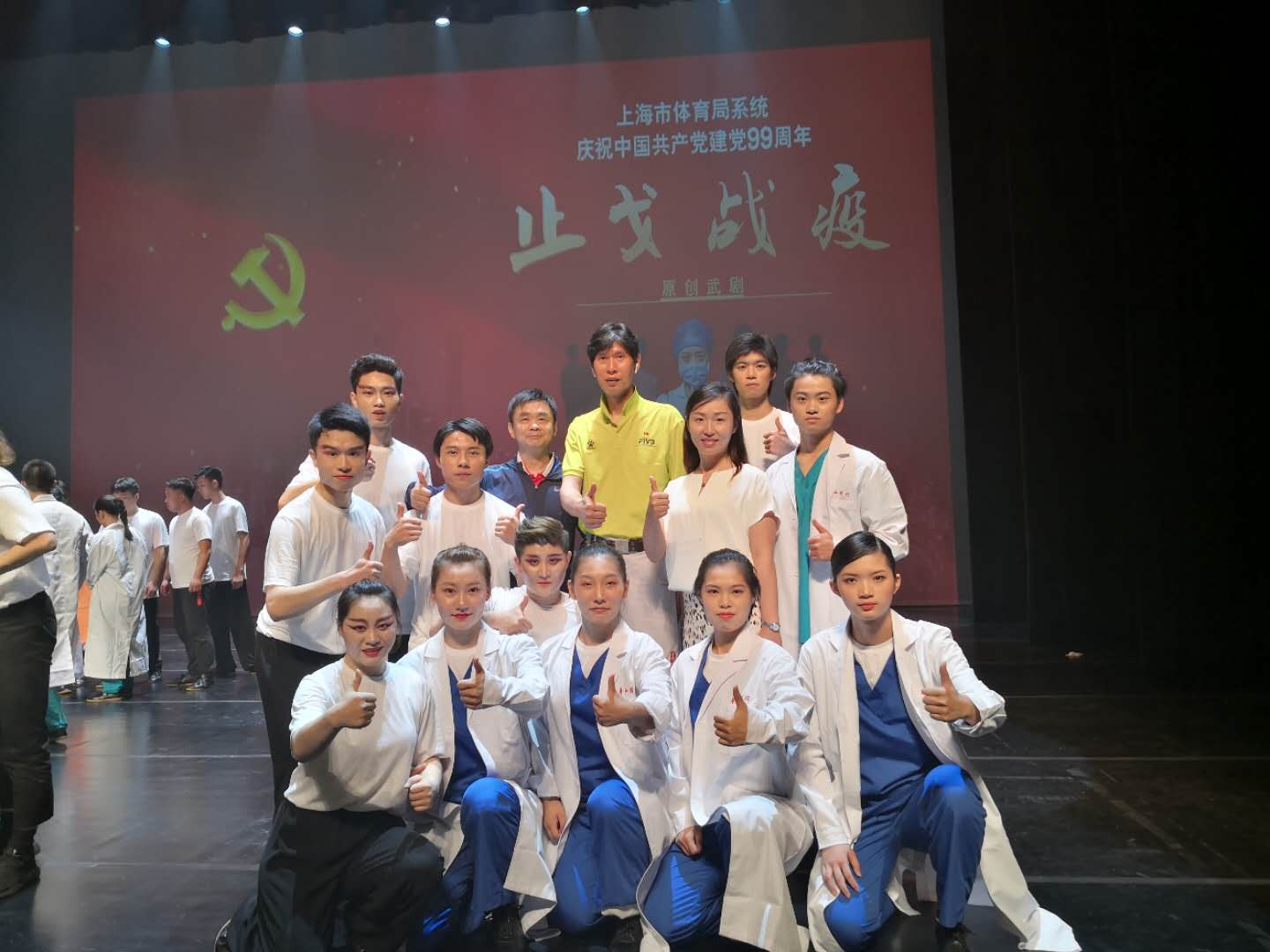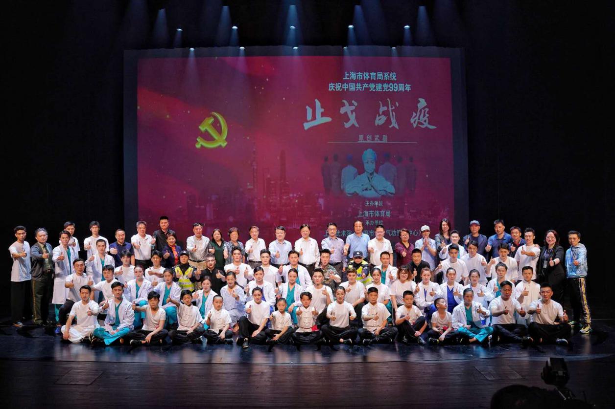 7月6日,为庆祝中国共产党成立99周年,向战斗在抗疫一线的“逆行者”们致敬,由上海市体育局牵头组织全国首个以抗疫为主题的原创武术舞台剧在上海国际舞蹈中心精彩上演。我校体育部党支部应上海市体育局直属机关党委的邀请,参与“一支部一特色”共建活动。活动期间,《止戈战疫》节目聘请校体育部党支部宣传委员、武术队总教练陆松廷担任总导演,邀请校武术队队员共同参演。