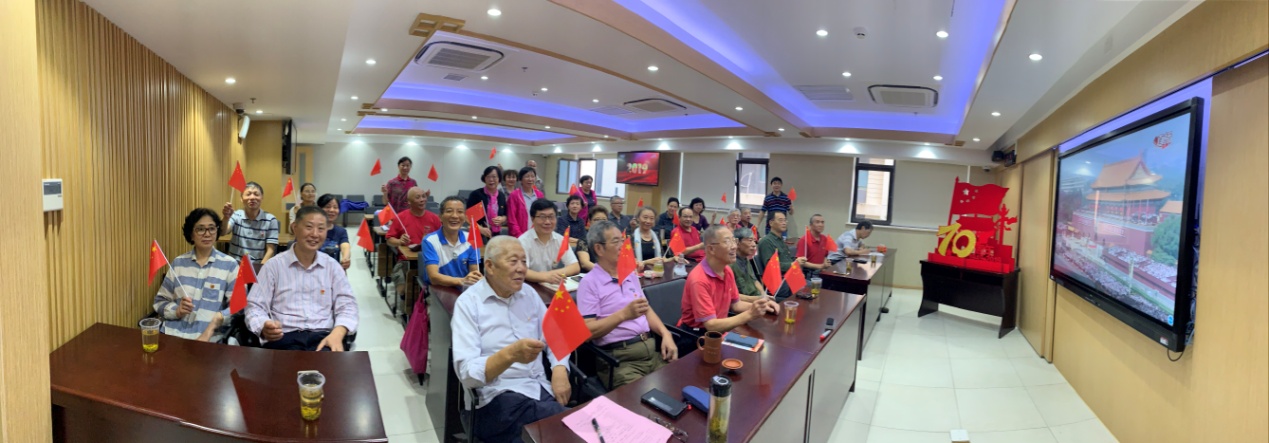 十点整,70声礼炮响彻云霄,庆祝大会正式开始,观看直播的全体人员肃然起立,一起高唱国歌。空中护旗梯队拉开了阅兵分列式序幕,三军列阵,庄严致敬,一个个方队踏着铿锵有力的步伐通过天安门广场,接受党和人民的检阅。各方队浩浩荡荡、气势磅礴,各种新型武器一一展现在世人面前。此时此刻,老同志们都激动万分、倍感自豪,纷纷感言,为雄壮的军威和强大的祖国感到由衷的骄傲和自豪。