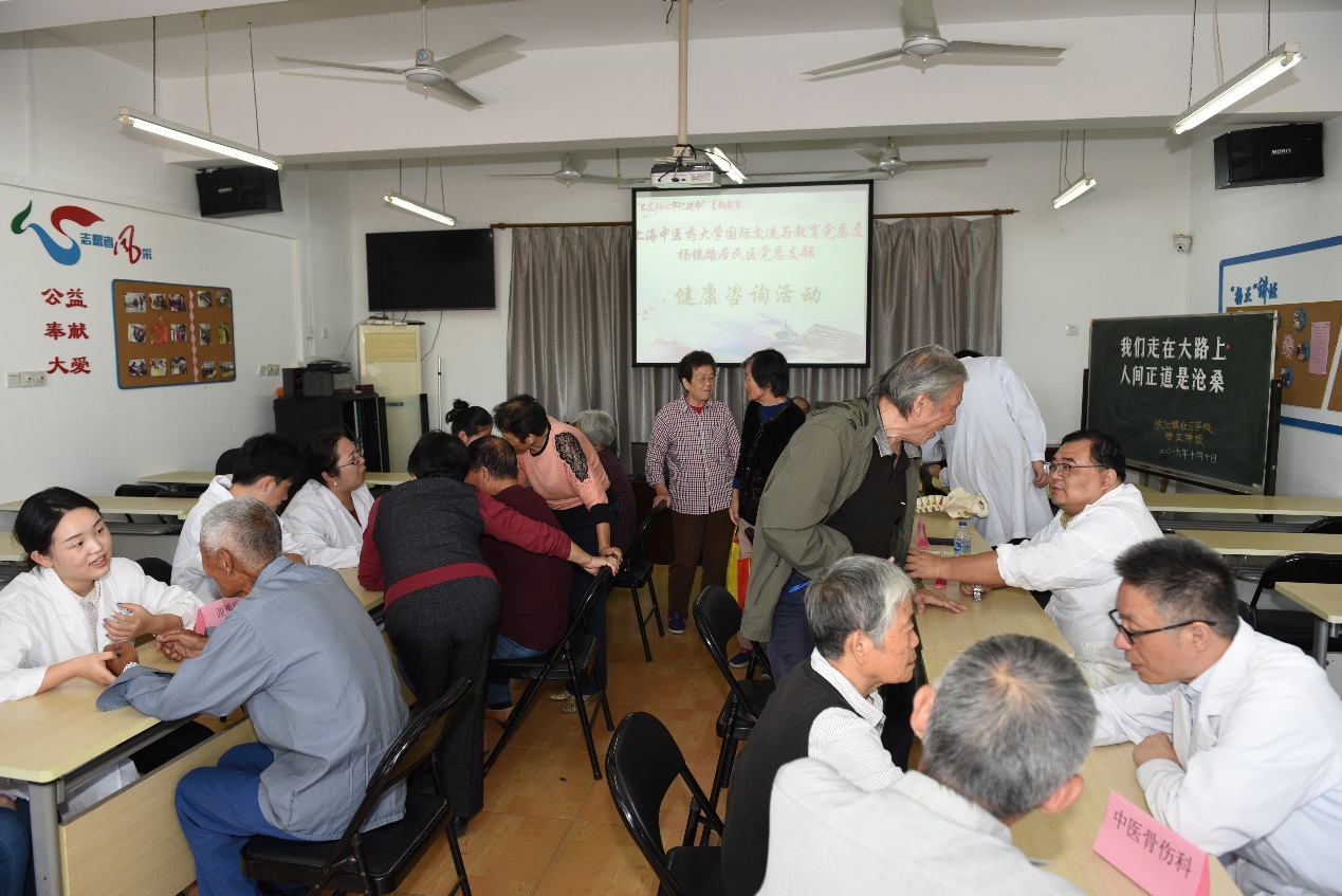 10月10日下午,为深入开展“不忘初心、牢记使命”主题教育,增强宗旨意识,切实在服务群众的实际行动中践行初心使命,增强党性修养,国际交流与教育党总支组织党员教师赴党建联建的张江镇杨镇路居民社区,为百姓开展义务健康咨询服务。