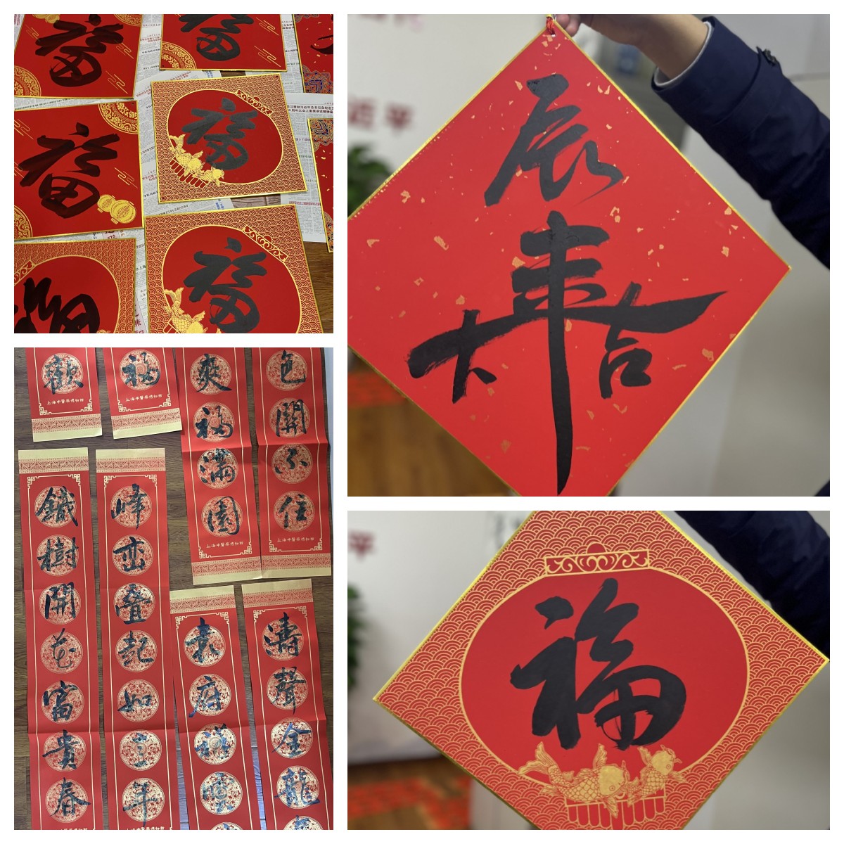 写春联、福字,是一种充满浓郁中国风的文化艺术活动,承载着中华民族的文化情感、民族记忆和美好希望。陆文耀启动“翰墨迎新”书法撰写活动。高壁为师生们讲解握笔和运笔的方法,并现场示范书写“福”和“龙”,用浓墨倾情为师生们送上新春祝福。应逸翔抽取三名幸运观众,根据他们的名字创作个性对联,“张灯结彩金龙来,聪颖聪慧财亨通”“花下化春三心归,木草龙马飞场来”“慧明慧觉慧春韵,珠光珠宝珠耀华”……这些红红火火的春联饱含美好的祝福,彰显着浓浓的喜庆氛围。