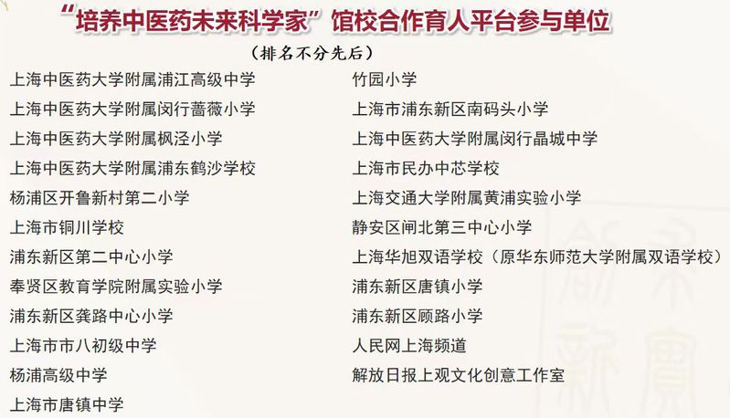 为充分挖掘中医药文化科学教育潜能,有效开展大中小学一体化中医药科学素养提升项目,进而培育孵化一批“中医药未来科学家”,共建中医药文化育人大格局,上海中医药博物馆联合上海市相关中小学、媒体成立“培养中医药未来科学家”馆校合作育人平台,汇聚合力推动中医药事业传承创新和高质量发展。