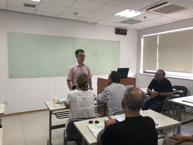 Lin Xun, dean of the International Education College at Shanghai University of Traditional Chinese Medicine, talks with the Greek students.