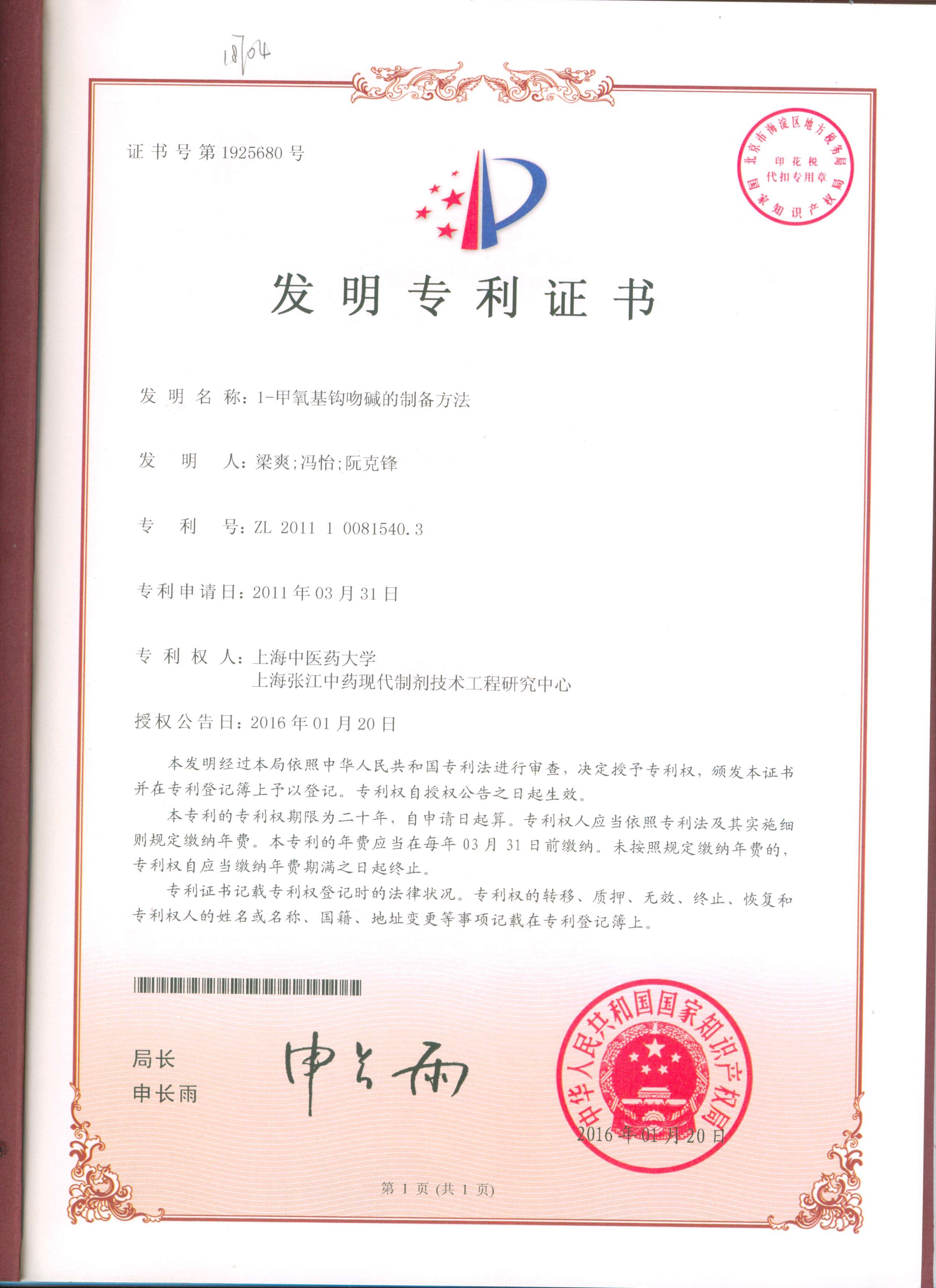 1-甲氧基钩吻碱的制备方法 专利证书