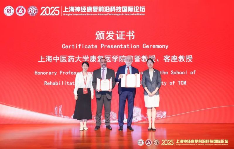 徐建光教授和我院党委书记郑莉为Rossini教授颁发国家中医康复中心特聘教授聘书。