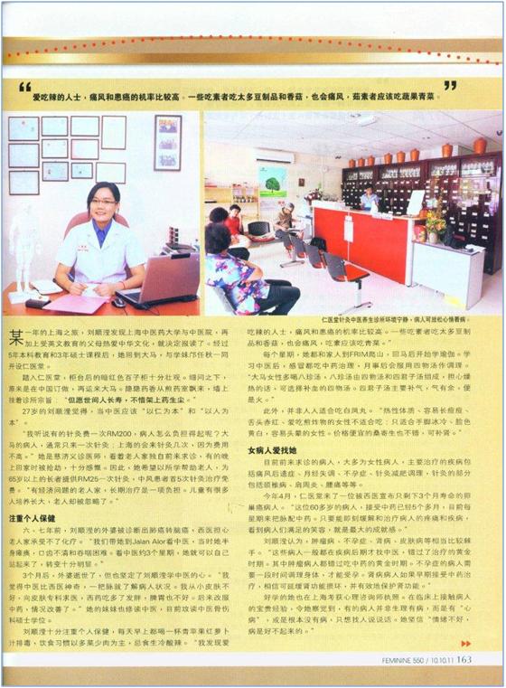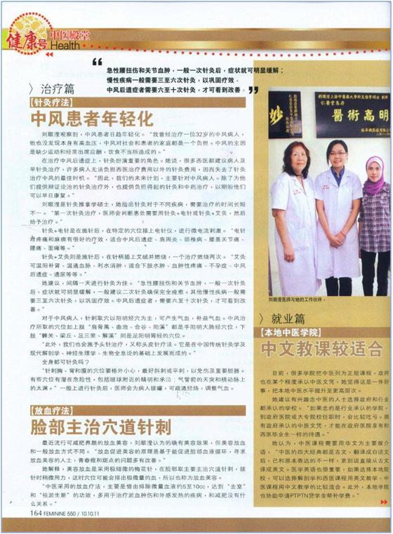马来西亚的中医医疗体系跟中国的不大相同,在马来西亚当医生,单单只是拥有一门绝活,是远远不够的,因为你需要治疗的不是单病,而是各式不同的病种。因此,在我完成了硕士针灸学位回来后,应用这段时间学会的针灸知识,套用在内科上,尝试用针灸治疗内科的更多疾病,例如,不孕症,月经病,脾胃病等等。当然,治疗方法的结合也很重要,因此,除了提供针灸治疗外,我还会给病人开汤药调理,试着从各方面的调整和提高治疗效果。