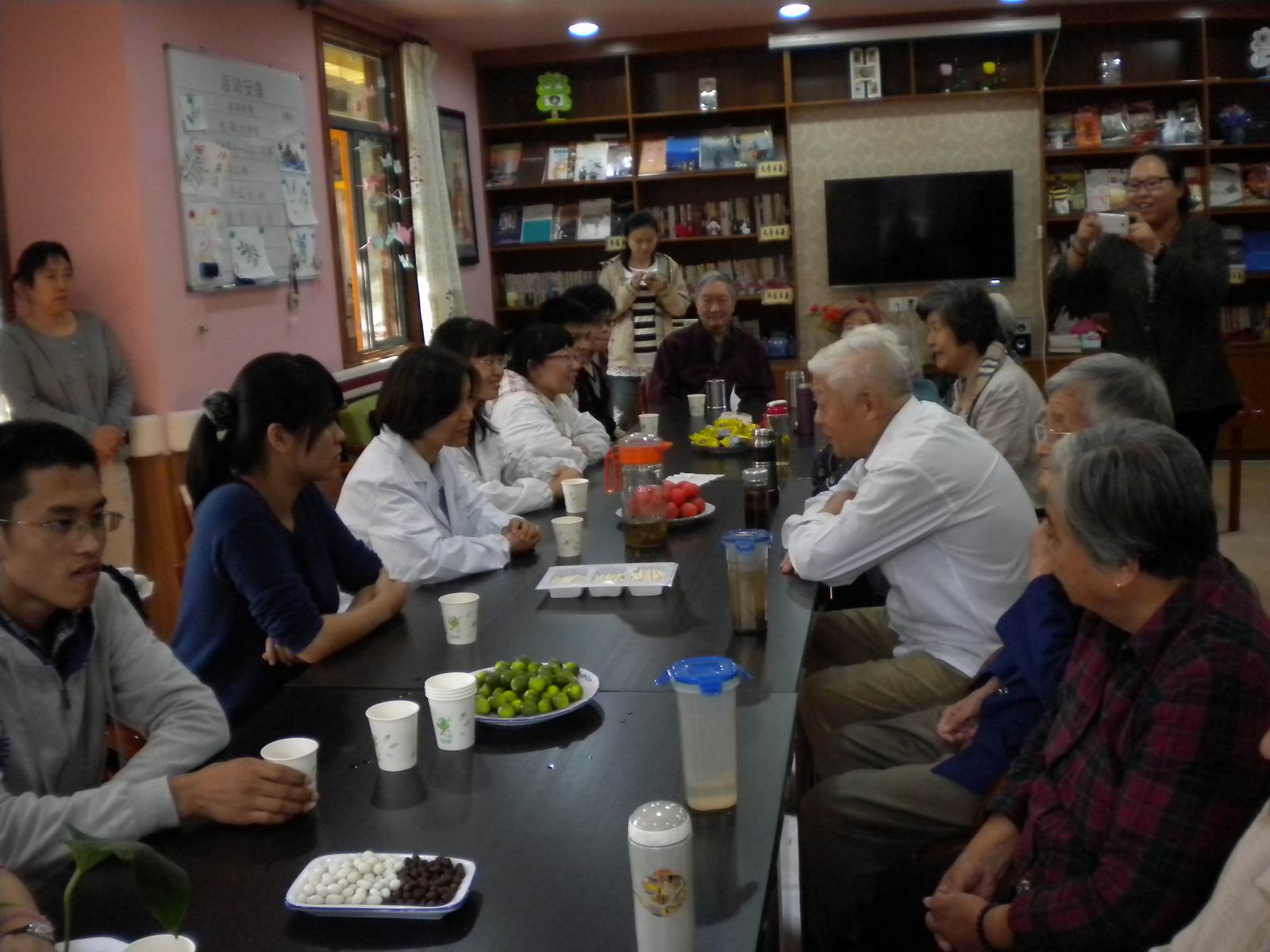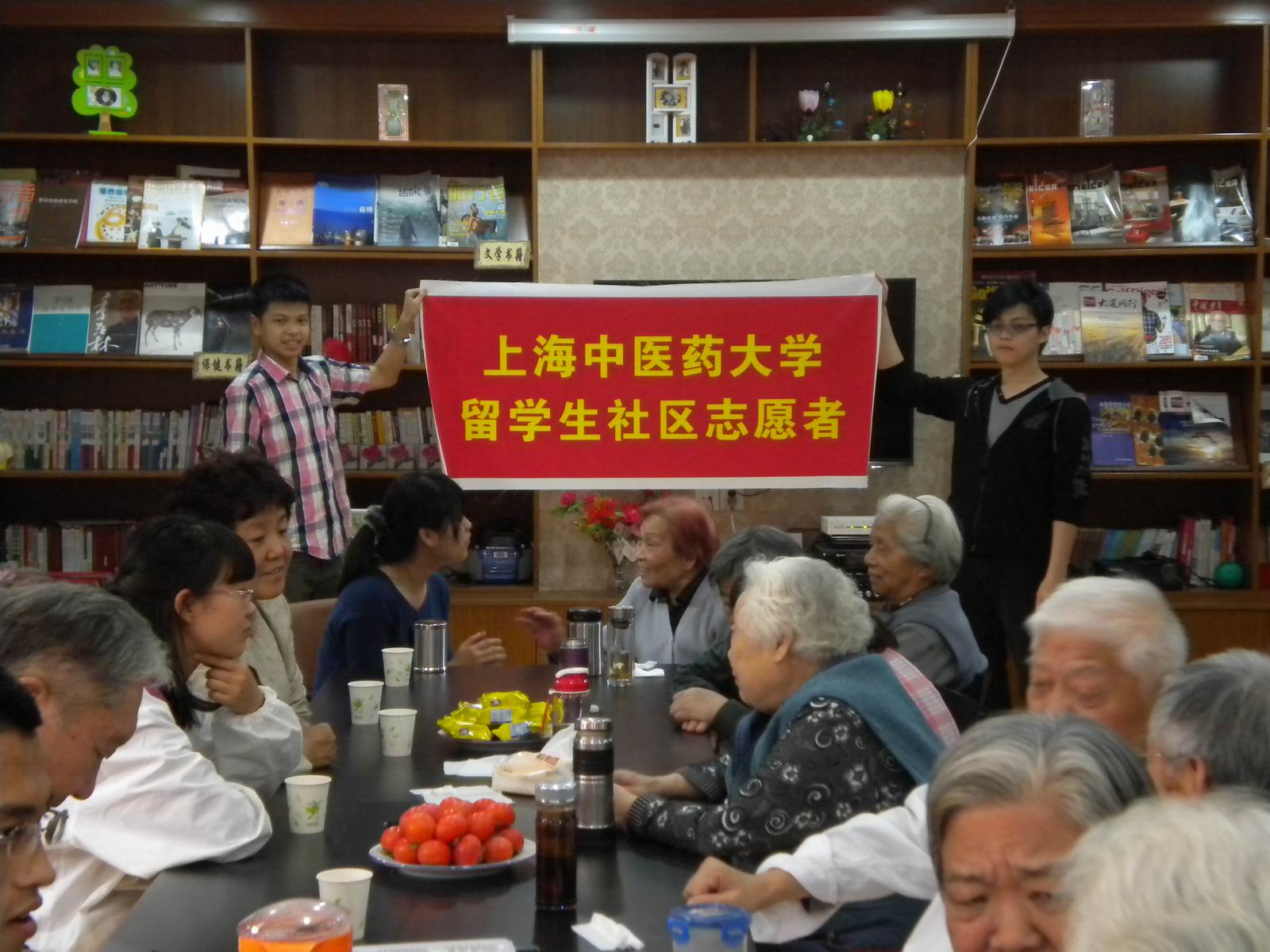 2014年10月15日,国教、国交党支部组织师生10余人来到浦东陆家嘴老年日间健康活动中心,为这里的老人提供健康咨询。教师志愿者发挥专业优势,为社区老人提供秋季养生咨询和体质辨识知识,以及秋季健康养生的方案。留学生志愿者们运用所学的知识和技能,为健康活动中心的老人们提供服务,受到社区老人的一致好评。通过志愿服务活动,教师志愿者体会到了服务社会的快乐,留学生们也纷纷表示这项活动对于帮助自己进一步了解中国国情和社会事业的发展很有帮助,也感受到了运用所学到的中医药知识服务社会的快乐。
