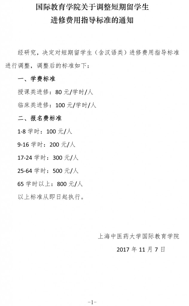 国际教育学院关于调整短期留学生 进修费用指导标准的通知